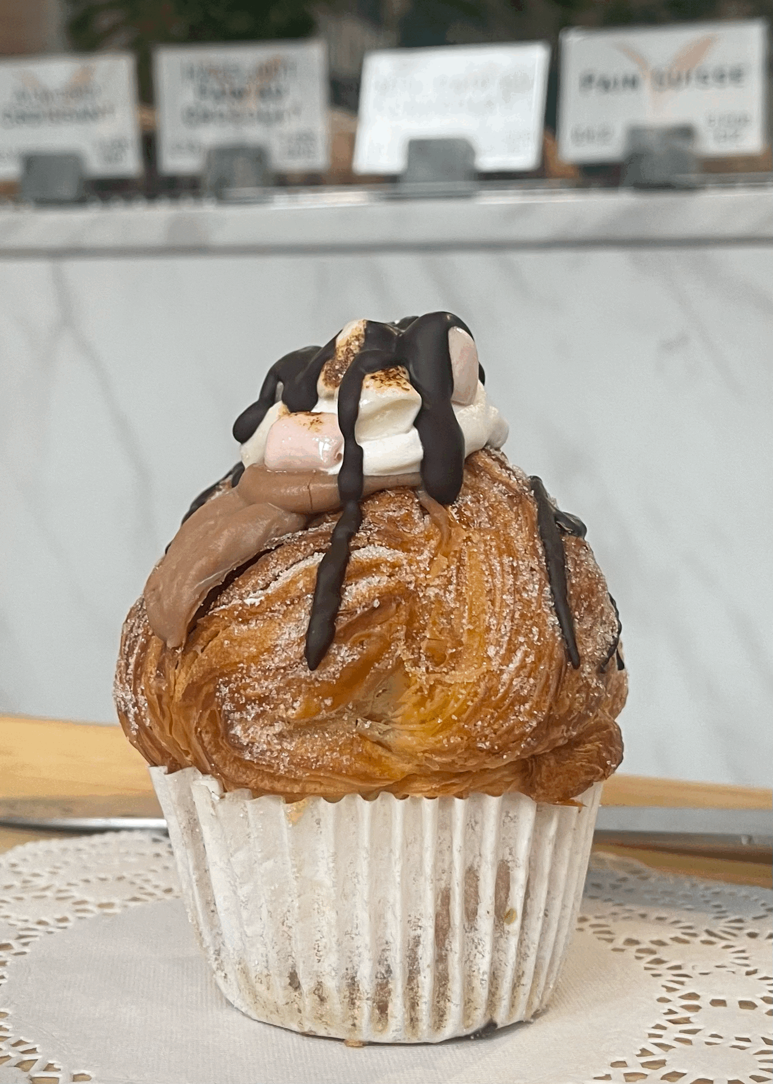 And 6 Hot Chocolate Cruffins (filled with a vegan ‘milk’ chocolate creme pattissiere and topped with vegan whipped cream, marshmallows and dark chocolate).